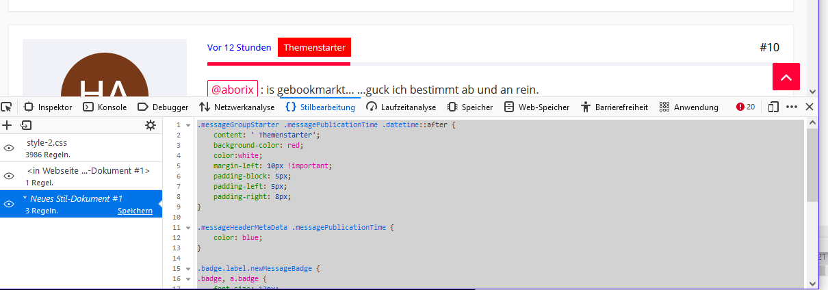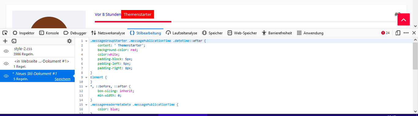 Alles anzeigen.messageGroupStarter .messagePublicationTime .datetime::after { content: ' Themenstarter'; background-color: red; color:white; margin-left: 10px !important; padding-block: 5px; padding-left: 5px; padding-right: 8px; } .messageHeaderMetaData .messagePublicationTime { color: blue; } .badge.label.newMessageBadge { .badge, a.badge { font-size: 13px; } .badge, a.badge { background-color: blue; border-radius: 2px; color: white; display: inline-block; line-height: 1.28; padding: 2px 6px; position: relative; vertical-align: middle; white-space: nowrap; word-wrap: normal; font-weight: 400; } }Jetzt siehts mit dein Zeile so aus. Aber wie macht man es, dass es im Forum so anzeigt? Habe es als CSS-Datei geladen. Oder funkt es nur mit dem Stilbearbeitung?
