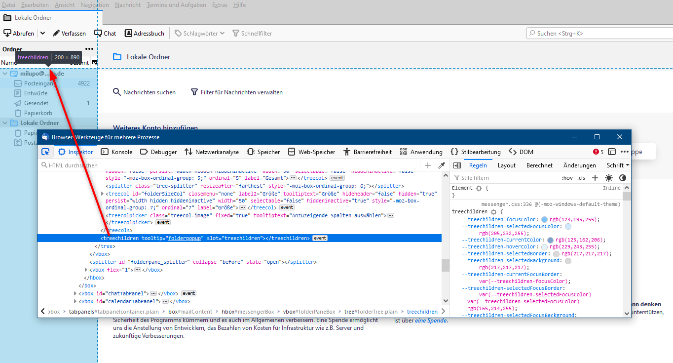 In der Thunderbird-Erweiterung "Phoenity Icons" gibt es CSS-Dateien, die die Symbole ansprechen, aber nicht per Konto, sondern nur per Ordner-Typ. Es gibt also die Selektoren, aber wie findet man die heraus? Warum ist die Seitenleiste auch beim Firefox nicht per Inspektor untersuchbar? Gibt es dafür einen anderen Weg?