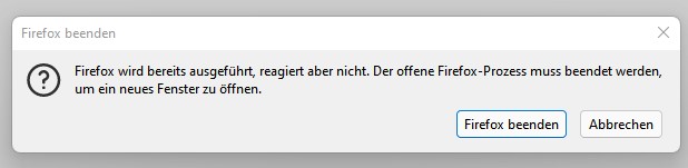 Gehe ich auf "Firefox beenden" schließt sich FF und geht danach direkt mit dem Link wieder auf. Wenn aber FF nicht geöffnet ist und ich einen Link z.B. in Thunderbird öffne geht FF-Standard auf wenn ich jetzt einen zweite Link öffne wird der in einem neuen TAB geöffnet. Die Fehlermeldung von oben kommt da nicht. Was muss ich ändern das auch bei geöffneten FF-Standard der externe Link in einem neuen TAB aufgeht?