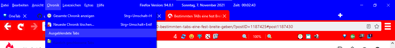 • harff182 Schaue mal in das Skript 15_mehr_in_Chronik.uc.js oder stelle es am besten hier ein. Das klingt nach Zusatzeinträgen in der Chronik und der überzählige Eintrag ist ja im Menü Chronik und nicht im Tab-Kontextmenü.