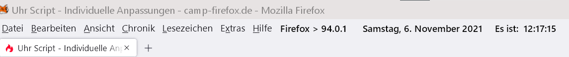 Alles anzeigenfunction doDatClockCallback() { try{ doDatClock(); } catch(ex){} } function doDatClock() { var options = { weekday: 'long', year: 'numeric', month: 'long', day: 'numeric', hour: '2-digit', minute: '2-digit', second: '2-digit' }; var locale = language || window.navigator.languages[0]; var timestr = new Date().toLocaleDateString( locale , options ); if( count == 1 ) { var counter = new Date( 1000 * sec ).toISOString().substr( 11 , 8 ); // .replace(/^[0:]+/, '') // if you want to replace zeroes and : timestr = timestr + ' (' + counter + ')'; sec++; } var ua = window.navigator.userAgent; var FFstr = ua.split(' '); var FF = FFstr[FFstr.length-1].replace( '/' , ' ' ); var text = "Firefox " + AppConstants.MOZ_APP_VERSION_DISPLAY; var agent = document.getElementById('statusbar-agent-display'); agent.setAttribute( 'value', text ); var status = document.getElementById('statusbar-clock-display'); status.setAttribute( 'value', timestr ); window.setTimeout( doDatClockCallback , 1000 ); } var sec = 0; var count = 0; // if you don't want a counter set this to zero var language = 'de-DE'; // locale, e.g. 'de-DE' , 'en-US' , 'fr-FR' var css = 'padding-top: 9px !important; padding-left: 5px !important; color: black; font-weight: 700; text-shadow: none;'; var ClockStatus = document.getElementById("tabbrowser-tabs"); var AgentLabel = document.createXULElement('label'); AgentLabel.setAttribute('id', 'statusbar-agent-display'); AgentLabel.setAttribute('class', 'statusbarpanel-text'); AgentLabel.setAttribute('style', css); var ClockLabel = document.createXULElement('label'); ClockLabel.setAttribute('id', 'statusbar-clock-display'); ClockLabel.setAttribute('class', 'statusbarpanel-text'); ClockLabel.setAttribute('style', css); ClockStatus.parentNode.insertBefore(ClockLabel, ClockStatus.nextSibling); ClockStatus.parentNode.insertBefore(AgentLabel, ClockStatus.nextSibling); doDatClock();Eigener Text wird nicht benutzt.