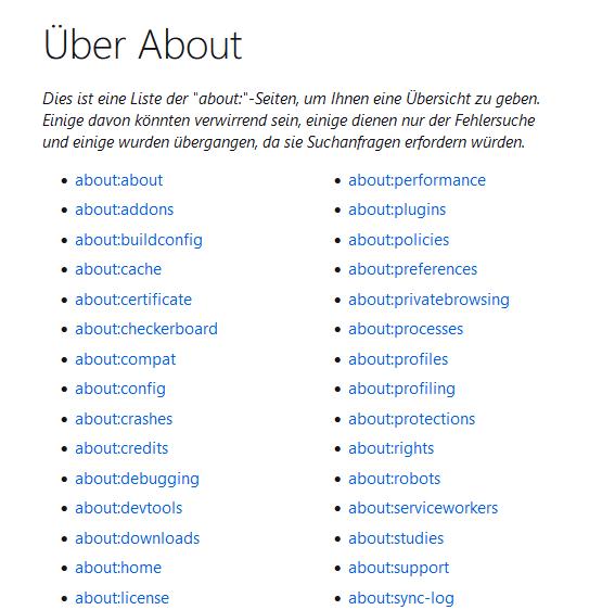 • Ich habe für mich etwas umgeschraubt, statt about:config zu about:about.