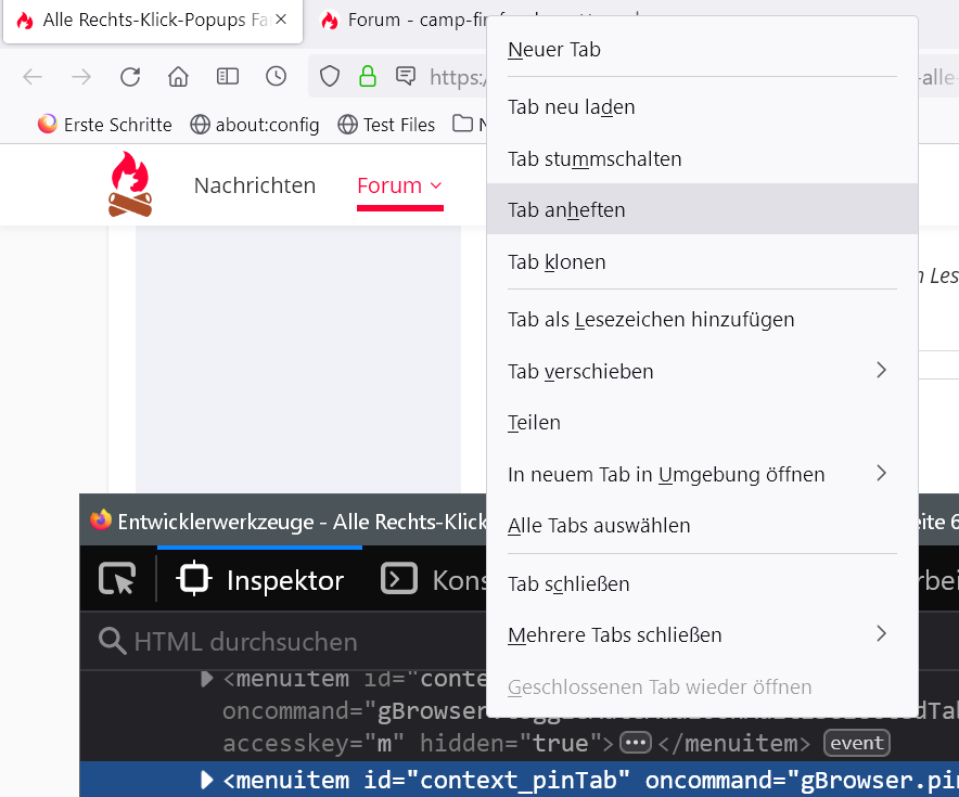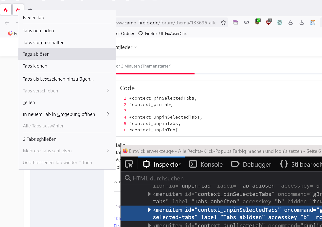 Wenn man auf Tab Rechtsklick macht sieht man nirgends was mit "gewählte Tabs anheften" oder "gewählte Tabs ablösen" oder "Tabs ablösen"..