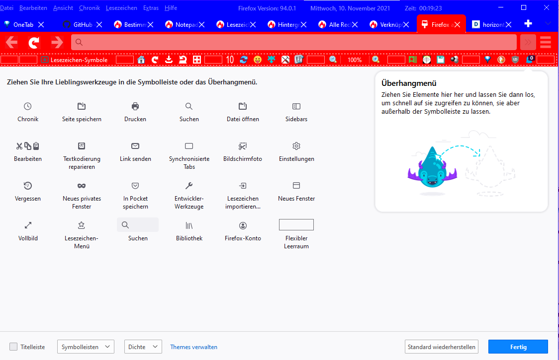 Oder wenn du es als Icon dort wo die anderen Icons sind, haben willst. Dann oben im Menü Rechtsklick machen und auf "Symbolleiste anpassen..." klicken. Dann siehst du folgendes Fenster vor dir.