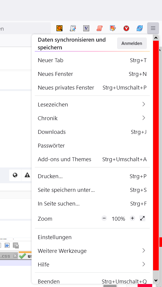 Alles anzeigen/* Scrollbar farbig innerhalb vom Firefox */ :root{ /* Farbe 1: Thumb - Farbe 2: Hintergrund*/ scrollbar-color: red lightgrey; } :root:active { /* Farbe 1: Thumb - Farbe 2: Hintergrund*/ scrollbar-color: blue lightgrey; }Firefox neu gestartet?