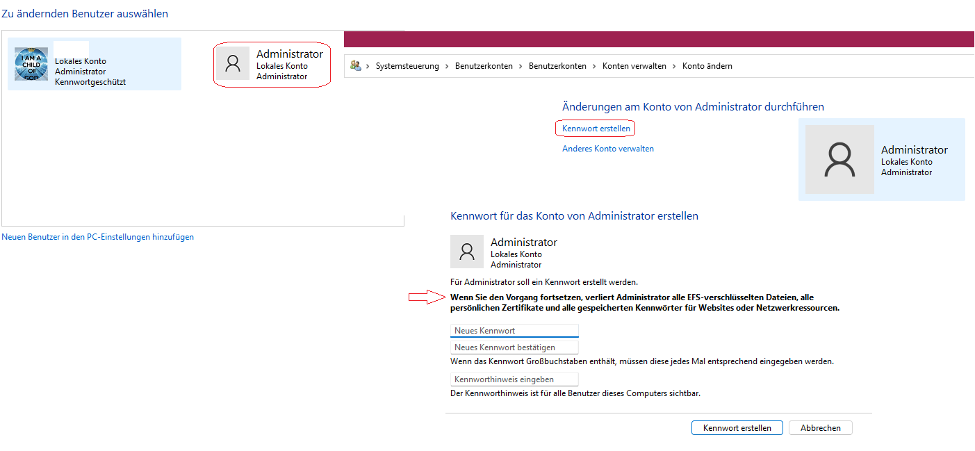 - Danach unter Benutzerkonten -> anderes Konto für das ('versteckte') Administrator-Konto ein Kennwort erstellt