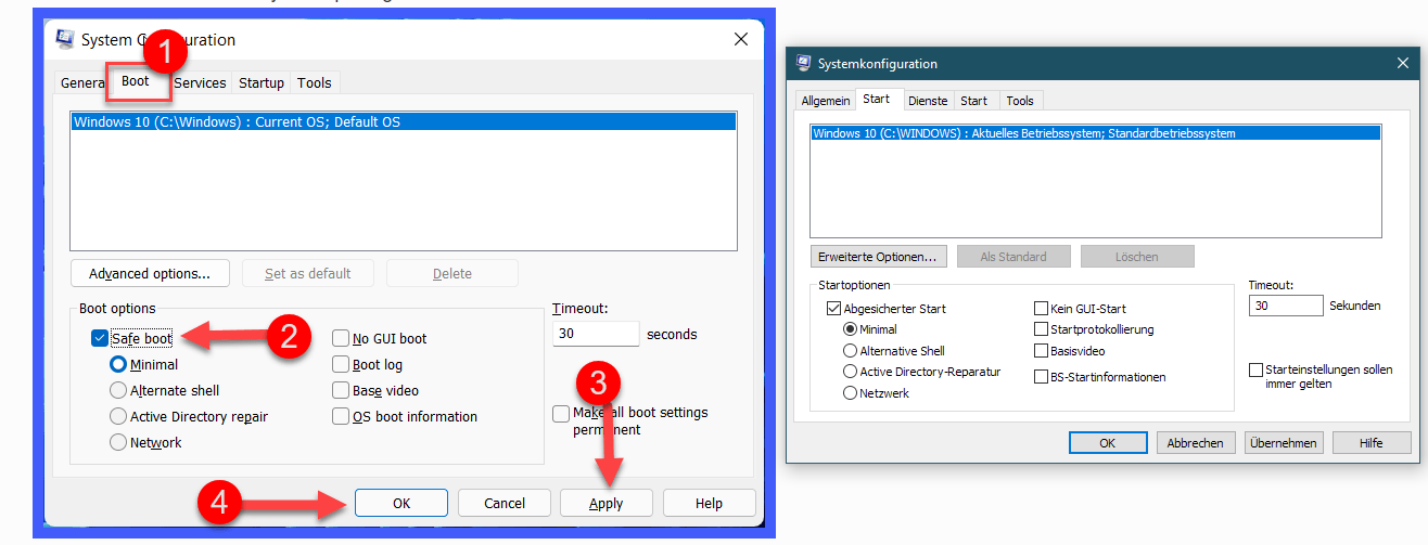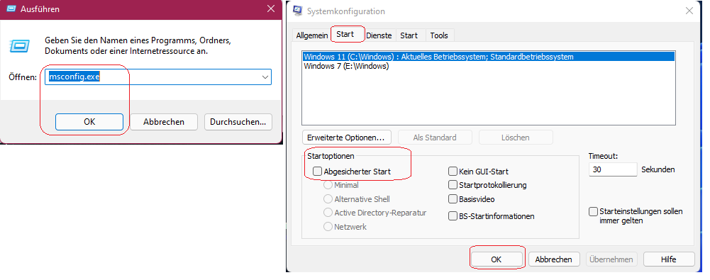 Vor einem weiteren Neustart, dann natürlich das Häkchen bei 'Abgesicherter Start' wieder entfernen!
