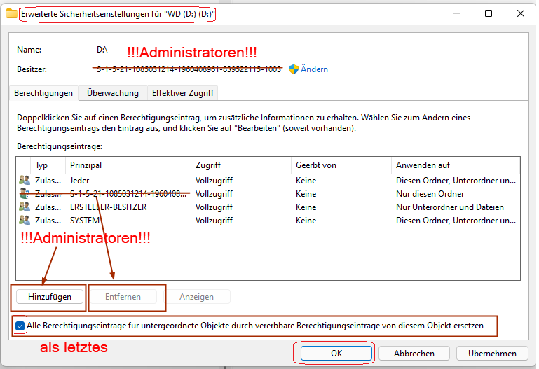 Ausser "Administratoren" (ist eine Gruppe), "Jeder" und "Ersteller/Besitzer" gehört da nichts rein. "Benutzer [...]" ist schon wieder spezifisch, kann, muss aber nicht. Namentlich genannte Nutzer gehören da auch nicht rein, ausser man will mehr Rechte als "Jeder" verteilen". Und da die S-1-... schon Besitzer ist, ist da im Vorfeld einiges schief gelaufen (siehe oben).