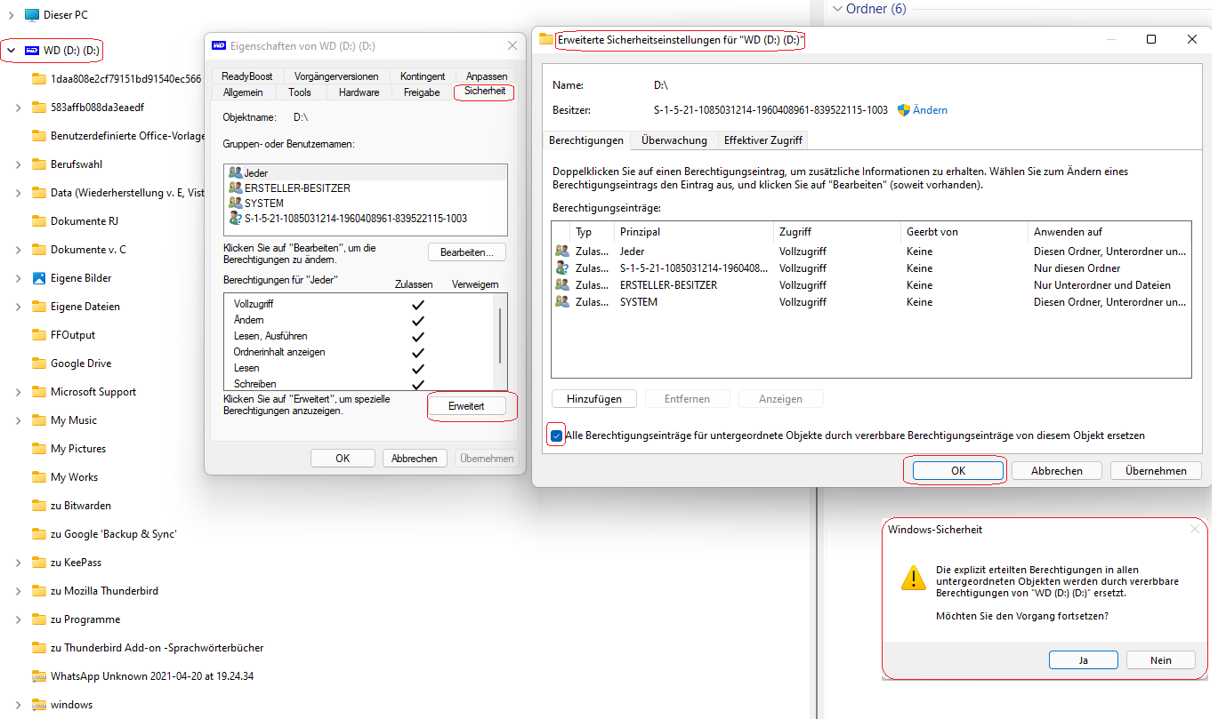 Die anderen Ordner müssen bei den erweiterten Rechten etwas anders aussehen, da kannst du selbst vorher nochmal vergleichen. Aber dann giltdas, was ich vorher konstatierte: das passiert nicht von allein. Daher auch die Frage, ob du unter Win10 mal die Eigenen Dateien verschoben hast, es ist ja auch Bild von dir zu sehen dass dieser Ordner verschachtelt ist, das macht man nicht selbst, ergibt keinen Sinn.