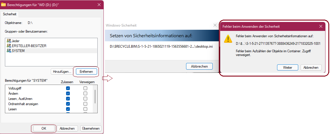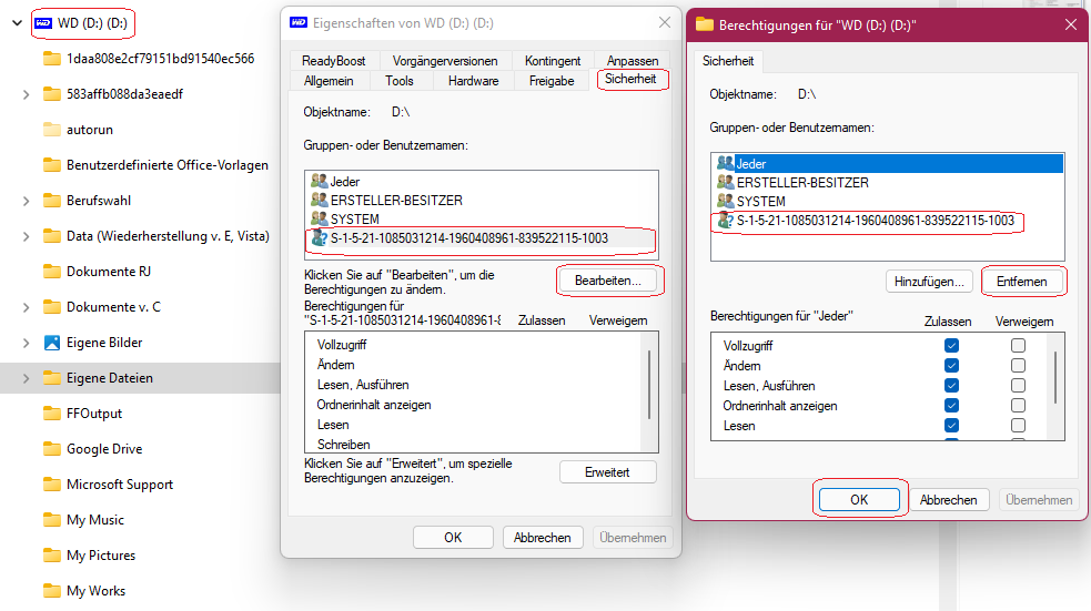 Und damit zur ersten Frage - das war die User-ID unter Windows 10, die es unter Windows 11 nicht mehr gibt. Das schrieb ich ja vorher schon - Rechte sind an diese ID gebunden, nicht an irgendwelche Namen. Wenn die diese S-1-... los wirst in der Rechtevergabe, ist auch dein Problem Geschichte.