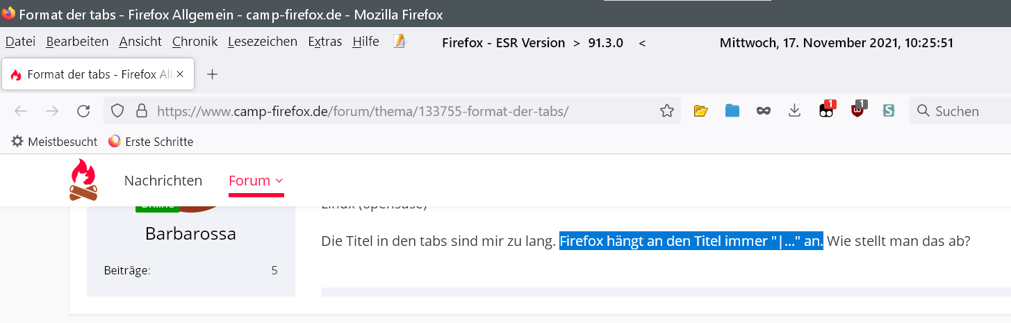 Die Titel in den tabs sind mir zu lang. Firefox hängt an den Titel immer "|..." an. Wie stellt man das ab?