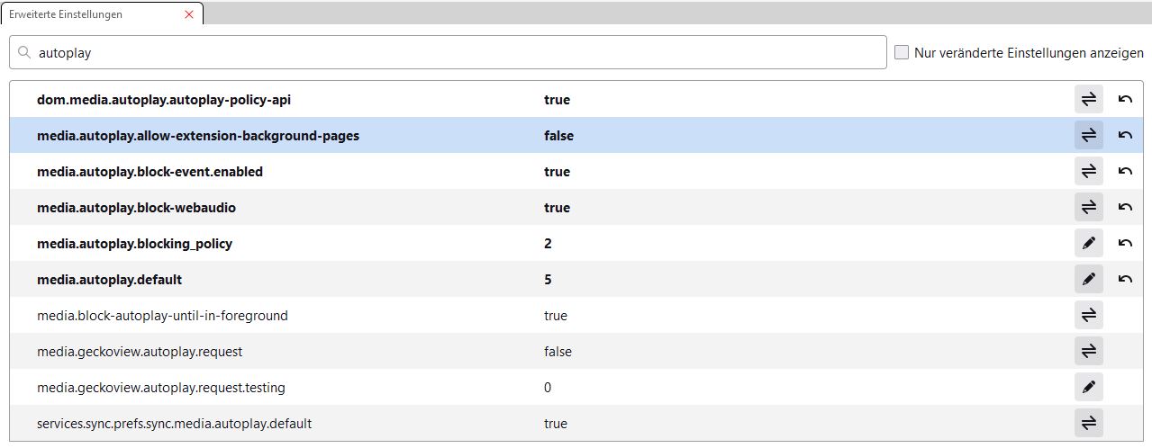In der Umgebung nach Eingabe von about:config, autoplay in die Suchzeile eingeben.