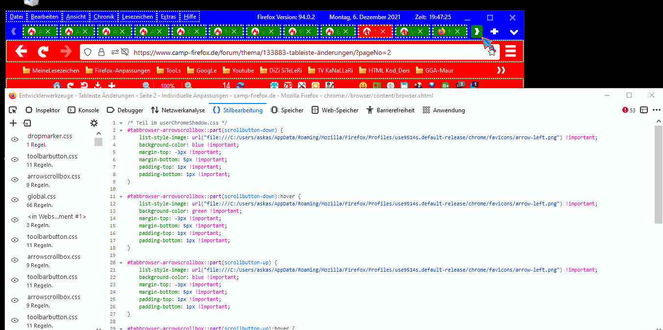CSS: userChrome.csstoolbarbutton#scrollbutton-down, toolbarbutton#scrollbutton-up { color: white !important; background-color: blue; border: 1px solid red; }CSS: userChromeShadow.css#tabbrowser-arrowscrollbox::part(scrollbutton-up), #tabbrowser-arrowscrollbox::part(scrollbutton-down) { fill: yellow !important; background-color: red !important; border: 5px solid green!important; }Man darf halt in der 'userChrome.css' kein !important verwenden. Ausnahme: Alle Elemente, die das Standardverhalten überschreiben müssen, in diesem Fall fill. Nutzt man dann in der 'userChromeShadow.css' das selbe Element, kann man es nicht mehr überschreiben und man hat dann eben die gleiche Vordergrundfarbe. Hier kann man aber bei den Scrollbuttons der Lesezeichen-Leiste auch alternativ color benutzen und hat somit doch wieder die Möglichkeit unterschiedliche Farben zu setzen.
