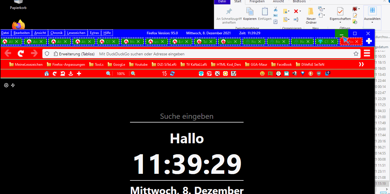 Alles anzeigen/* Teil im userChromeShadow.css */ #tabbrowser-arrowscrollbox::part(scrollbutton-down) { list-style-image: url("file:///C:/Users/askas/AppData/Roaming/Mozilla/Firefox/Profiles/use9514s.default-release/chrome/favicons/arrow-left.png") !important; background-color: blue !important; margin-top: -3px !important; margin-bottom: 5px !important; padding-top: 1px !important; padding-bottom: 1px !important; } #tabbrowser-arrowscrollbox::part(scrollbutton-down):hover { list-style-image: url("file:///C:/Users/askas/AppData/Roaming/Mozilla/Firefox/Profiles/use9514s.default-release/chrome/favicons/arrow-left.png") !important; background-color: green !important; margin-top: -3px !important; margin-bottom: 5px !important; padding-top: 1px !important; padding-bottom: 1px !important; } #tabbrowser-arrowscrollbox::part(scrollbutton-up) { list-style-image: url("file:///C:/Users/askas/AppData/Roaming/Mozilla/Firefox/Profiles/use9514s.default-release/chrome/favicons/arrow-left.png") !important; background-color: blue !important; margin-top: -3px !important; margin-bottom: 5px !important; padding-top: 1px !important; padding-bottom: 1px !important; } #tabbrowser-arrowscrollbox::part(scrollbutton-up):hover { list-style-image: url("file:///C:/Users/askas/AppData/Roaming/Mozilla/Firefox/Profiles/use9514s.default-release/chrome/favicons/arrow-left.png") !important; background-color: green !important; margin-top: -3px !important; margin-bottom: 5px !important; padding-top: 1px !important; padding-bottom: 1px !important; } /* Teil im normalen css */ #TabsToolbar #new-tab-button { list-style-image: url("file:///C:/Users/askas/AppData/Roaming/Mozilla/Firefox/Profiles/use9514s.default-release/chrome/favicons/neutab.png") !important; margin-top: -3px !important; margin-bottom: 5px !important; padding-top: 1px !important; padding-bottom: 1px !important; } #alltabs-button:hover, #TabsToolbar #new-tab-button:hover { --toolbarbutton-hover-background: green !important; } #alltabs-button { list-style-image: url("file:///C:/Users/askas/AppData/Roaming/Mozilla/Firefox/Profiles/use9514s.default-release/chrome/favicons/arrow-down.png") !important; margin-top: 1px !important; margin-bottom: 5px !important; padding-top: 1px !important; padding-bottom: 1px !important; }Von der Höhe der Icons sieht es für mich im Moment etwas akzeptabel aus.
