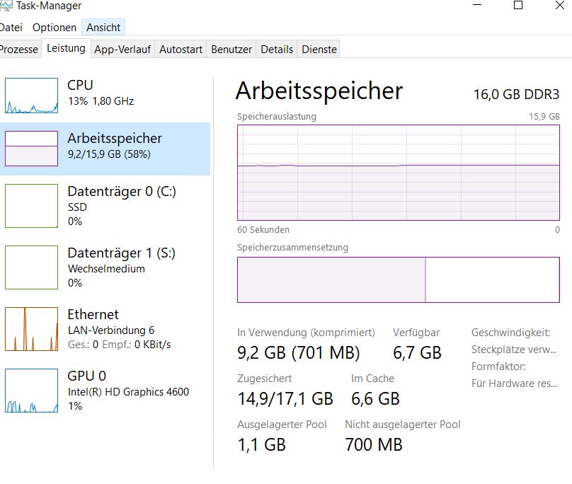 Die Speicheranzeige sagt klar, es wäre Speicher da. Wenn man den Cache berücksichtigt ist der zwar fast komplett belegt. Doch sollte Windows den Cache bei Bedarf sofort freigeben.