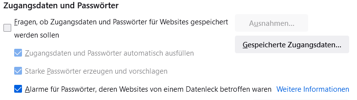 Wenn ich den Haken entferne bleibt aber unten noch der Haken bei "Alarme für Passwörter, deren Websites von Datenlecks betroffen waren"