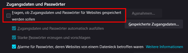 ich habe unter Datenschutz den Haken bei Zugangsdaten und Passwörter entfernt, da ich keine Passwörter speichern möchte.