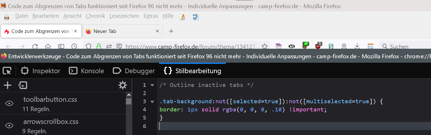Code zum Abgrenzen von Tabs funktioniert seit Firefox 96 nicht mehr