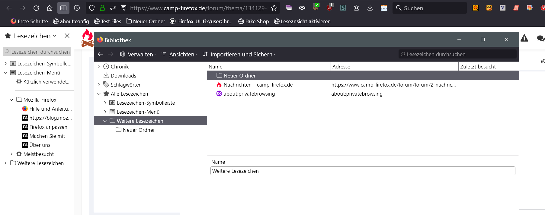 Grundsätzlich heller Hintergrund der Sidebar, im Bibliothek-Fenster, der about:support Seite und der about:addons Seite.
