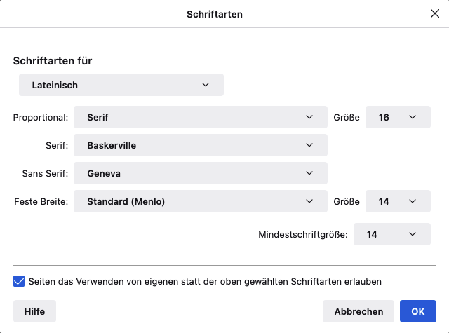• OK. Webseiten dürfen ihre eigenen Schriftarten verwenden. Der Wikipedia-Artikel gibt Baskerville und Geneva als Schriften für macOS an. Die solltest du auf deinem Mac zur Verfügung haben. Wende mal eine der beiden oder beide an und mache dafür das Häkchen raus.