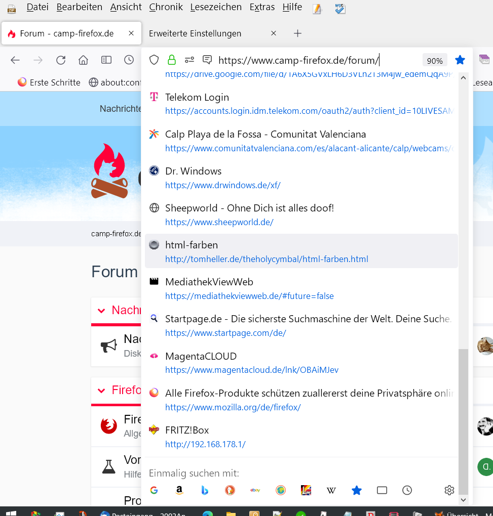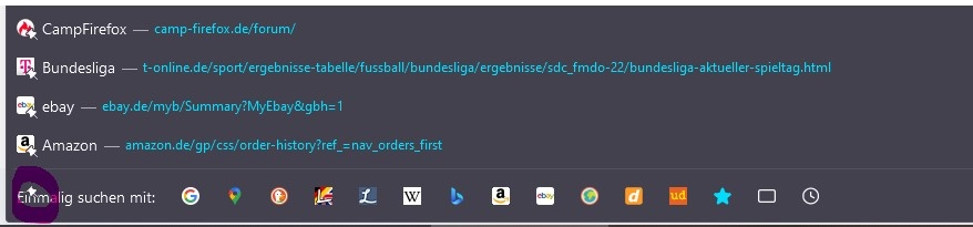 Über den about:config-Eintrag browser.urlbar.maxRichResults kann ich die Anzahl der Einträge aus den Verknüpfungen (max. 4 Zeilen x 8 Einträge = 32) bestimmen, die aufgehen, wenn ich auf die Adresszeile klicke. Da passen bei meiner HD-Auflösung im Kompaktmodus schlappe 27 hin, der Rest (Twitter ist hier die Grenze) ist abgeschnitten.