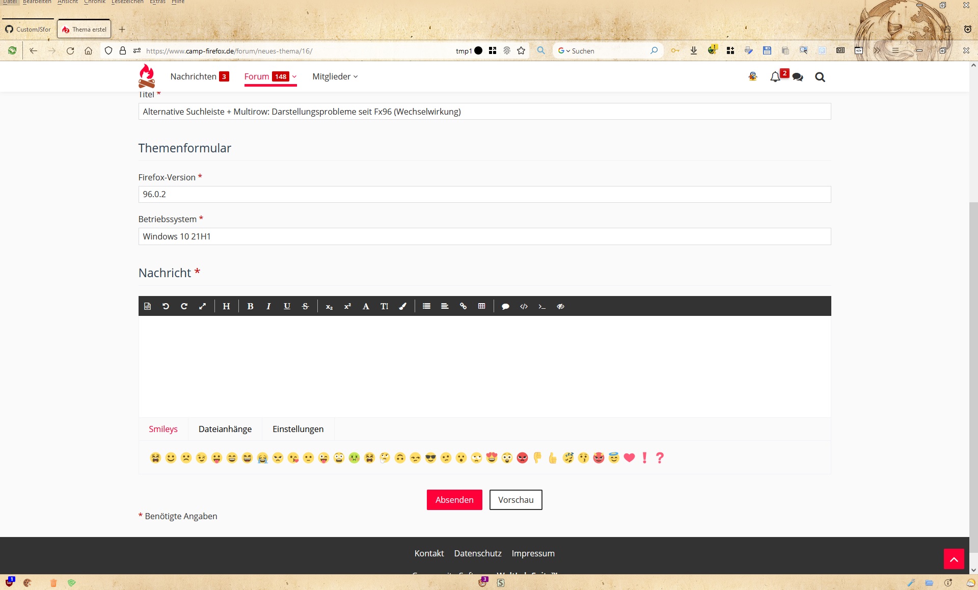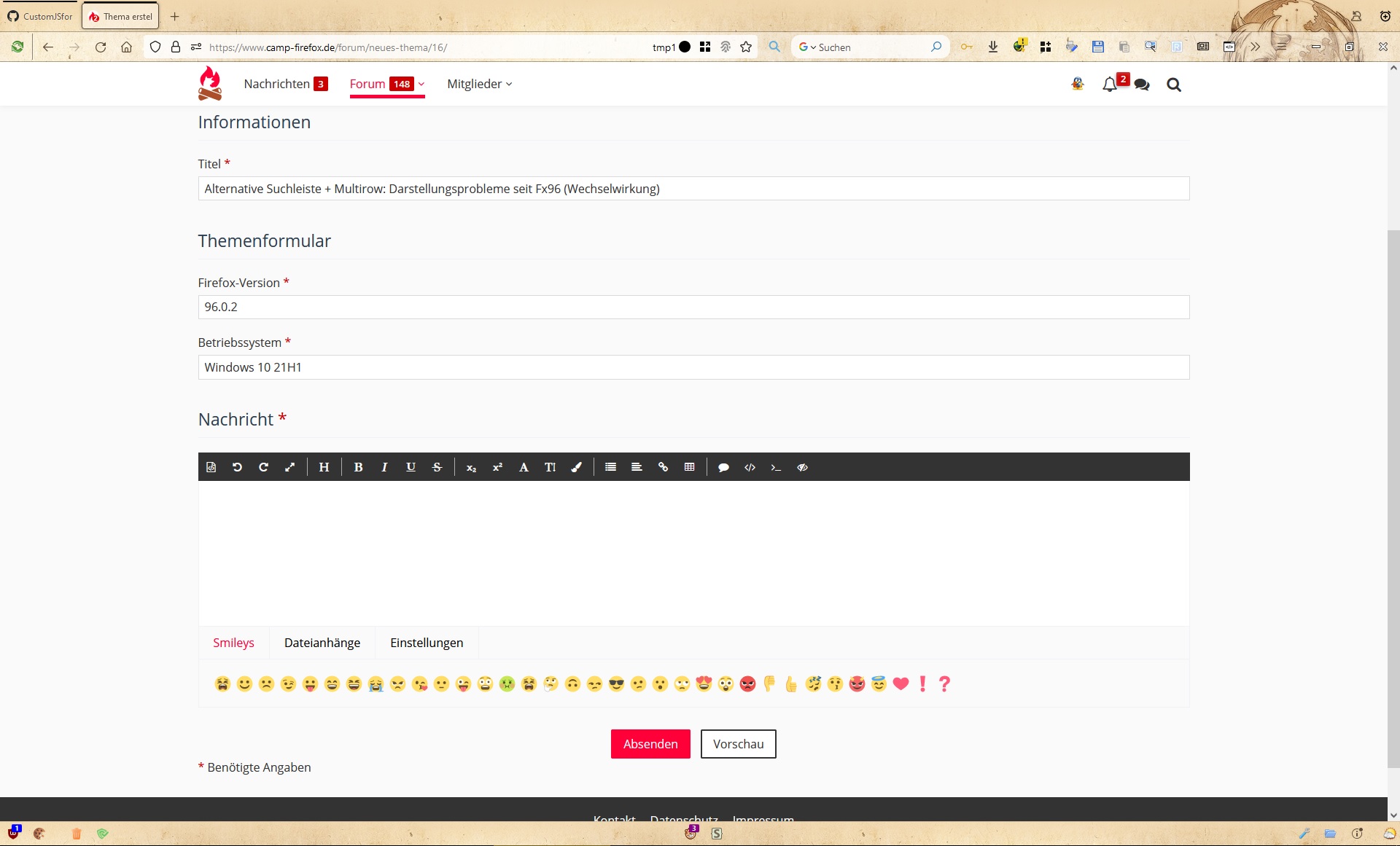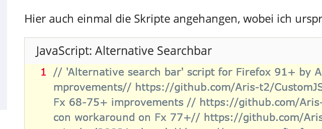 Seit dem Update auf Fx 96 verursachen das Skript alternative Searchbar und Multirow Darstellungsprobleme, wenn man beide gemeinsam nutzt. Einzeln treten sie nicht auf.