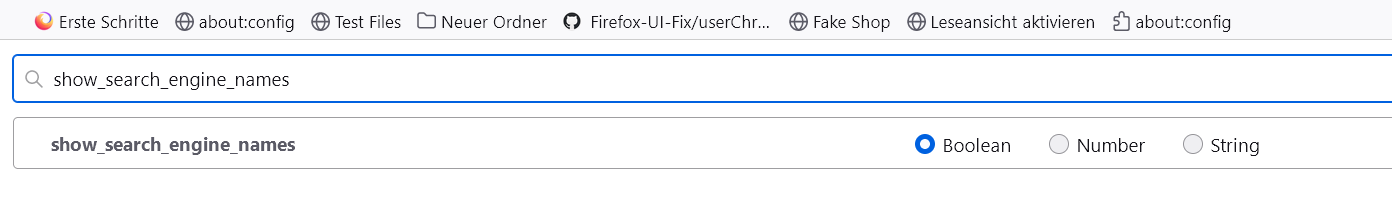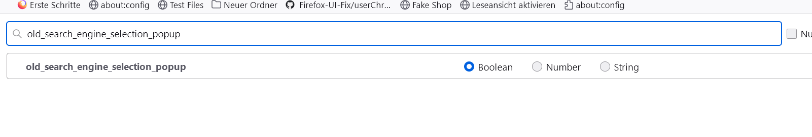 Damit meine ich "old_search_engine_selection_popup = true" und "show_search_engine_names = true". Unabhängig davon ob es nun auf true oder false gestellt ist, tritt der Fehler auf.