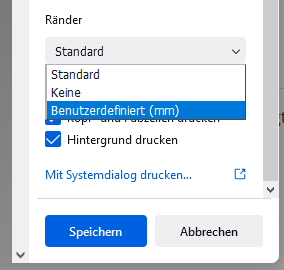 • In about:config bei paper_size_unit eine 1 vorgeben, dann werden mm in Ränder -> Benutzerdefiniert angezeigt.