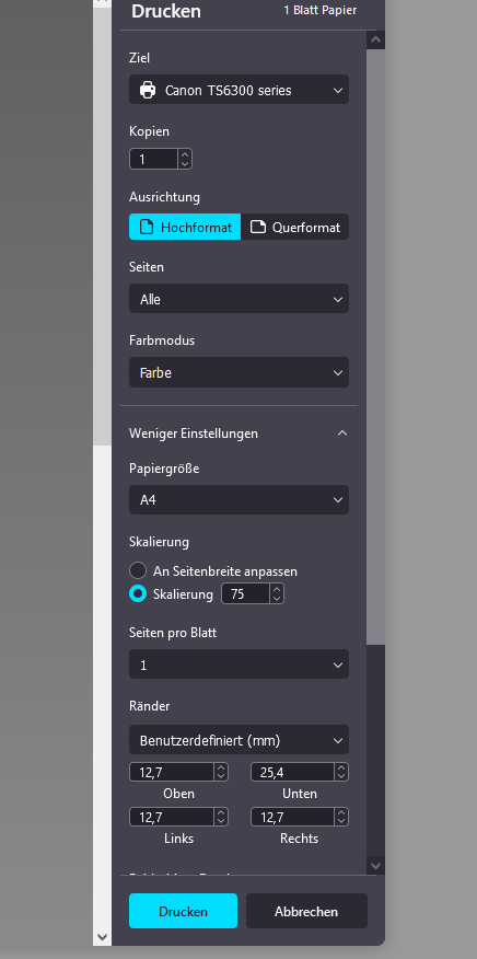 Ich habe alles Mögliche eingestellt und umgestellt: Mit Rand und ohne, benutzerdefiniert... . Auch in den Druckereinstellungen habe ich viel probiert. Der Drucker ist ein Canon Pixma TS 6350 .