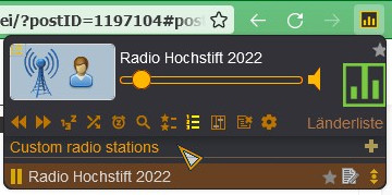 Ich habe die Erweiterung worldwideradio (Ver. 5.2)im Einsatz. Bis vergangene Woche funktionierte die Erweiterung einwandfrei und hatte dabei keine Schwierigkeiten den Sender Radio Hochstift (aus Deutschland) abzuspielen. Jetzt leider startet dieser Sender gar nicht mehr. Was habe ich gemacht, oder was muss ich ändern damit ich diesen Sender wieder über die Erweiterung "worldwideradio" hören kann, ausser über deren eigenen webplayer (https://www.radiohochstift.de/live/)? Andere Sender die ich über die Erweiterung höre,funktionieren ohne Probleme.