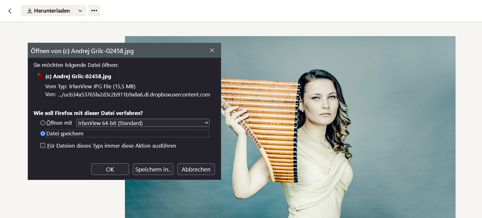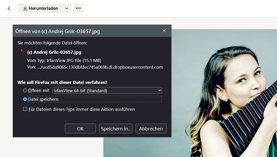 Wenn ich von dieser Dropbox versuche, die Fotos in hoher Resolution herunterzuladen, kommen statt der 15 MB nur 500 KB an?