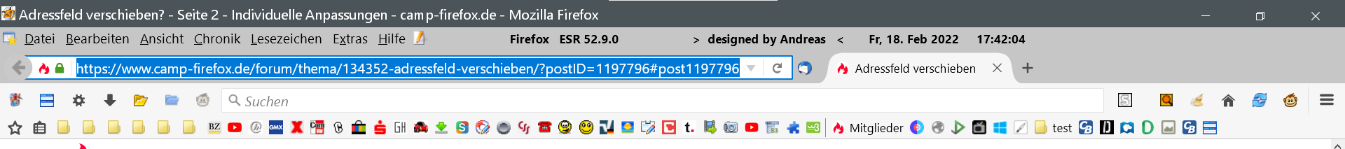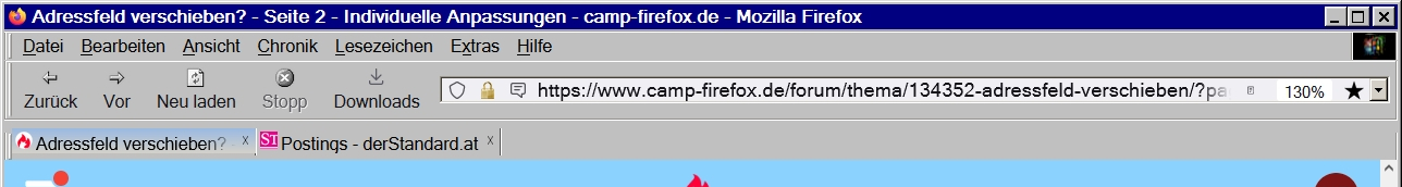 Was dann beim Start von Firefox passiert ist, dass die Adressleiste in die Menüleiste wandert und die Andeutung einer zusätzlichen Leiste unterhalb der nav-bar zu erkennen ist, soll heißen, die Leiste ist ca. 2mm hoch und/aber die Adressleiste lässt sich auch nicht dorthin verschieben.
