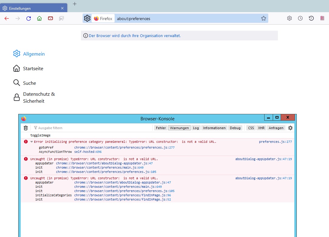 Error initializing preference category paneGeneral: TypeError: URL constructor: is not a valid URL. preferences.js:277