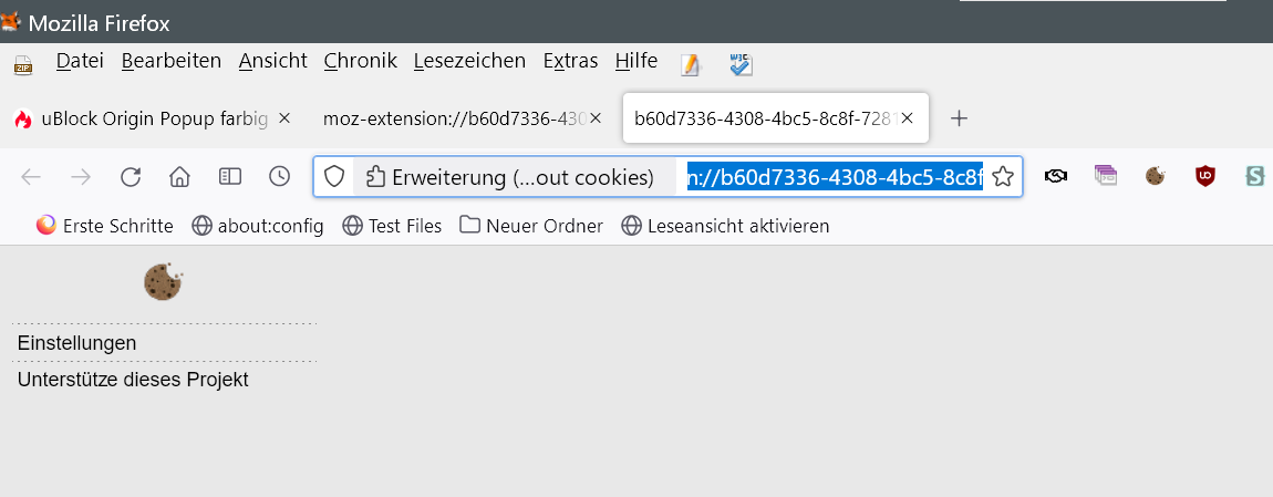 Ich habe auch ohne Rechtsklick den Code moz-extension://71f54c56-f6a3-4055-9e2e-9cb2ea7ffcd6/content/popup.html in die Browserzeile eingegeben dann öffnet sich das PopUp oben LINKS in der sonst leeren Seite und ist sofort wieder weg .........