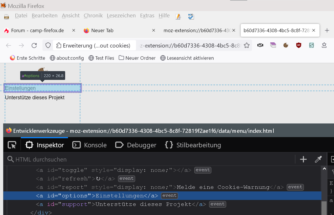Um die Popups von Erweiterungen zu öffnen zwecks Bearbeitung mit den Browser-Werkzeugen: