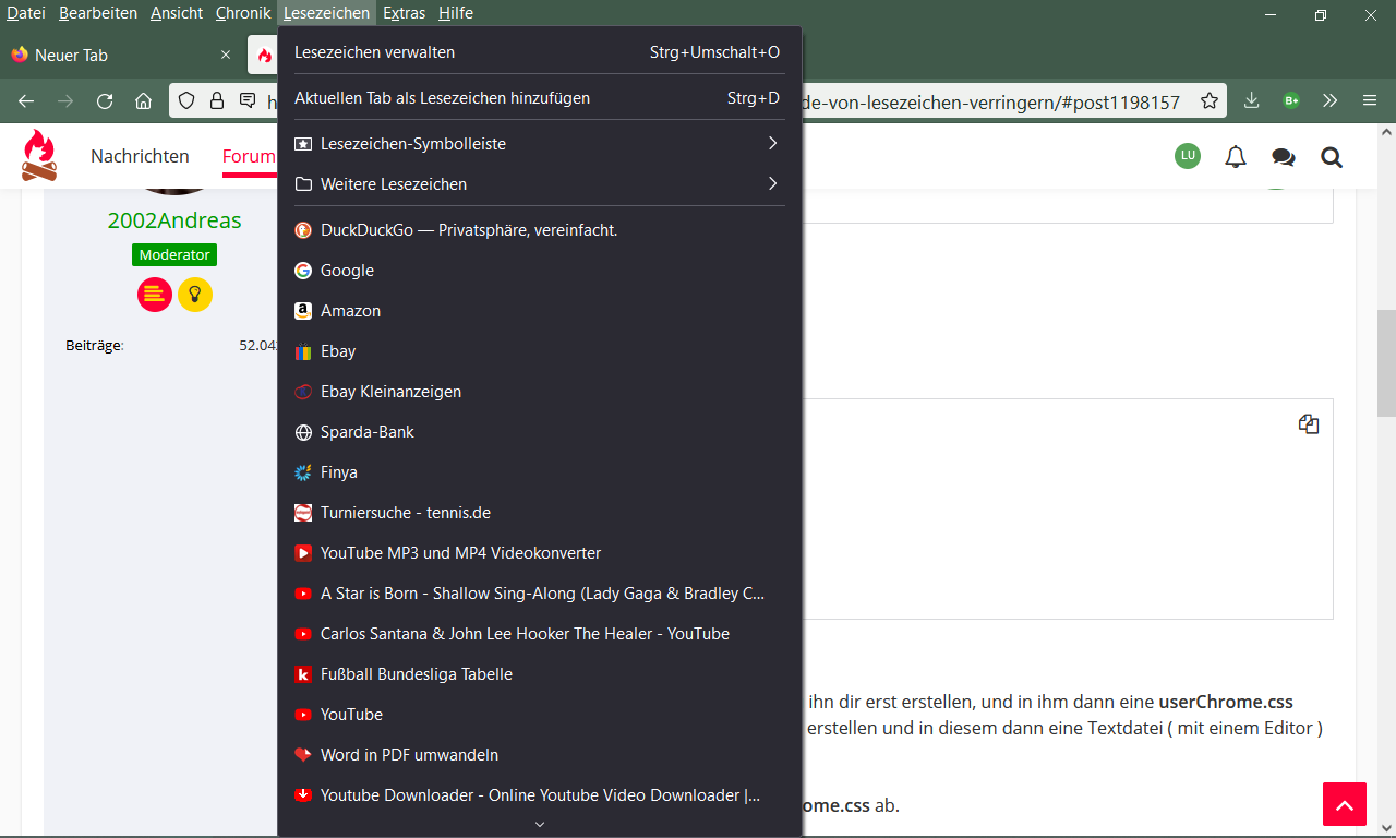 Beitrag #3 zeigt das Lesezeichen-Menü.