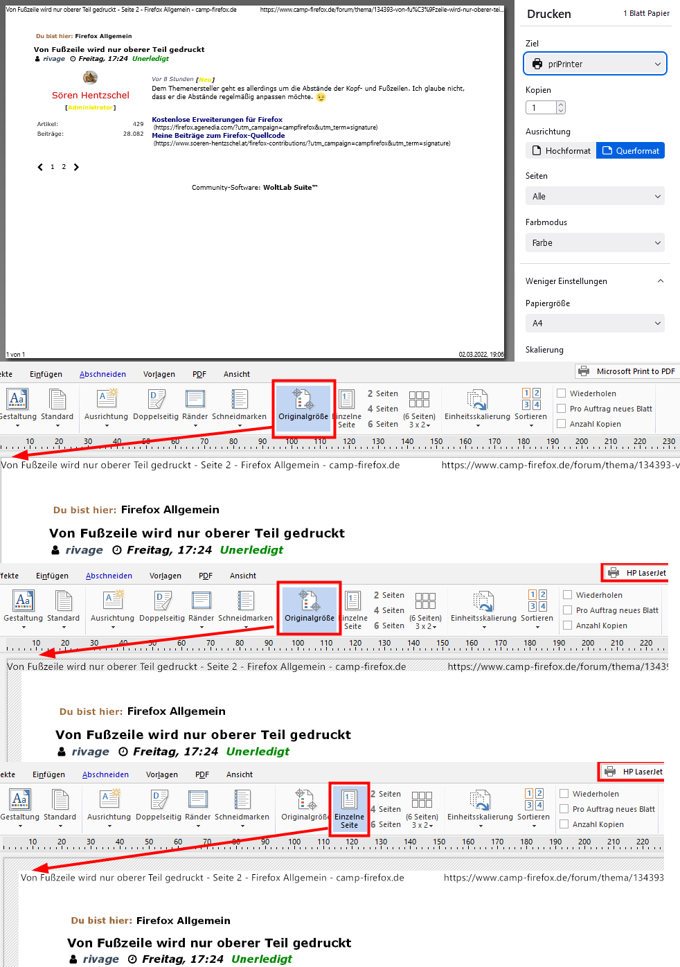 Wegen der Ränder, nochmal explizit gezeigt, dass die Anpassung der Ränder entweder in Firefox gesetzt werden muss, oder wie von mir gezeigt beim Ziel. Der PDF-Drucker kann die Ränder vom Laser-Drucker auslesen und zeigt mir ganz konkret an, ob der Inhalt drauf passt oder nicht. Und ich kenne keinen aktuellen Druckertreiber von HP, Epson oder Canon, um die bekanntesten zu nennen, die keine Druckvorschau anbieten zur Kontrolle, was da letztlich beim Drucker landet. Sollte man nutzen.