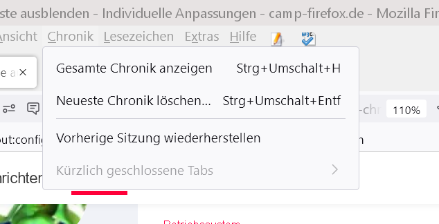 kann man in der Menüleiste den Menüpunkt Chronik komplett ausblenden? Die Alternative wäre, dass unter Chronik alle Einträge bleiben (bis Kürzlich geschlossene Fenster), aber die besuchten Seiten sollen nicht angezeigt werden.