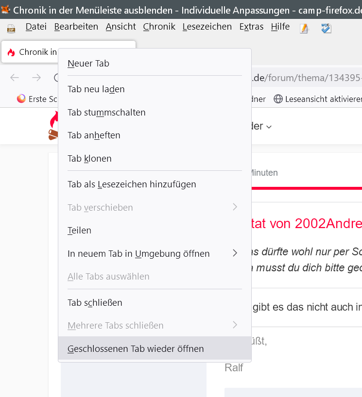 kann man in der Menüleiste den Menüpunkt Chronik komplett ausblenden? Die Alternative wäre, dass unter Chronik alle Einträge bleiben (bis Kürzlich geschlossene Fenster), aber die besuchten Seiten sollen nicht angezeigt werden.
