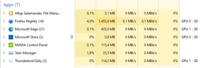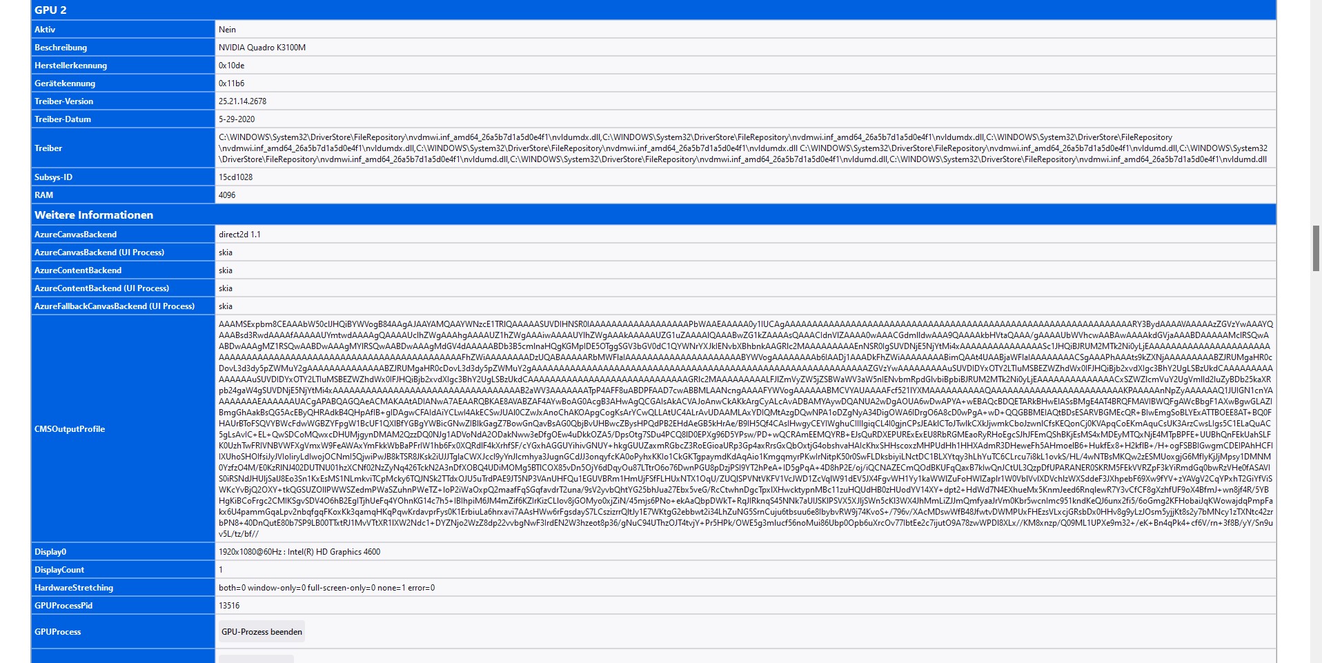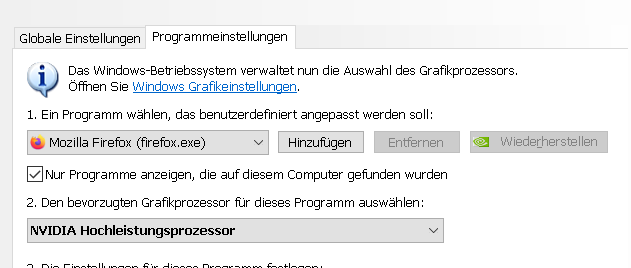 Ich habe schon einiges versucht, aber es gelingt mir nicht, Nightly (auch die Final verhält sich leider so) zur Zusammenarbeit mit einer dedizierten Grafikkarte zu überreden. Gerät (Dell Precision M6800) hat Dual-Grafik und benutzt grundsätzlich die iGPU. Thunderbird und MS Edge benutzen allerdings ohne Nachhilfe per Standard die Nvidia Quadro K3100M. Ich habe in der Nvidia Systemsteuerung angewiesen, das die Nightly doch bitte die Quadro nutzen soll, aber das hat auch nicht funktioniert. Auch das Zurücksetzen auf Standard und erneutes Einrichten hat diesen Zustand nicht verändert; der Taskmanager zeigt immer GPU 0 beim FF an. Oder geht das nicht anders beim FF? Hilf mir doch mal einer auf die Sprünge....
