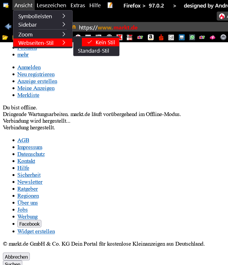 Das sieht auch so im Abgesicherten Modus aus und auch mein Test mit dem MS Edge 99 liefert das gleiche Ergebnis. Wie lange das schon so aussieht, kann ich nicht sagen, bin seit Längerem nicht auf der Seite gewesen. In der Konsole bekomme ich viele CORS-Fehler beim Laden der Seite, auch für weitere Resourcen (Fonts, Scripts) der Seite.