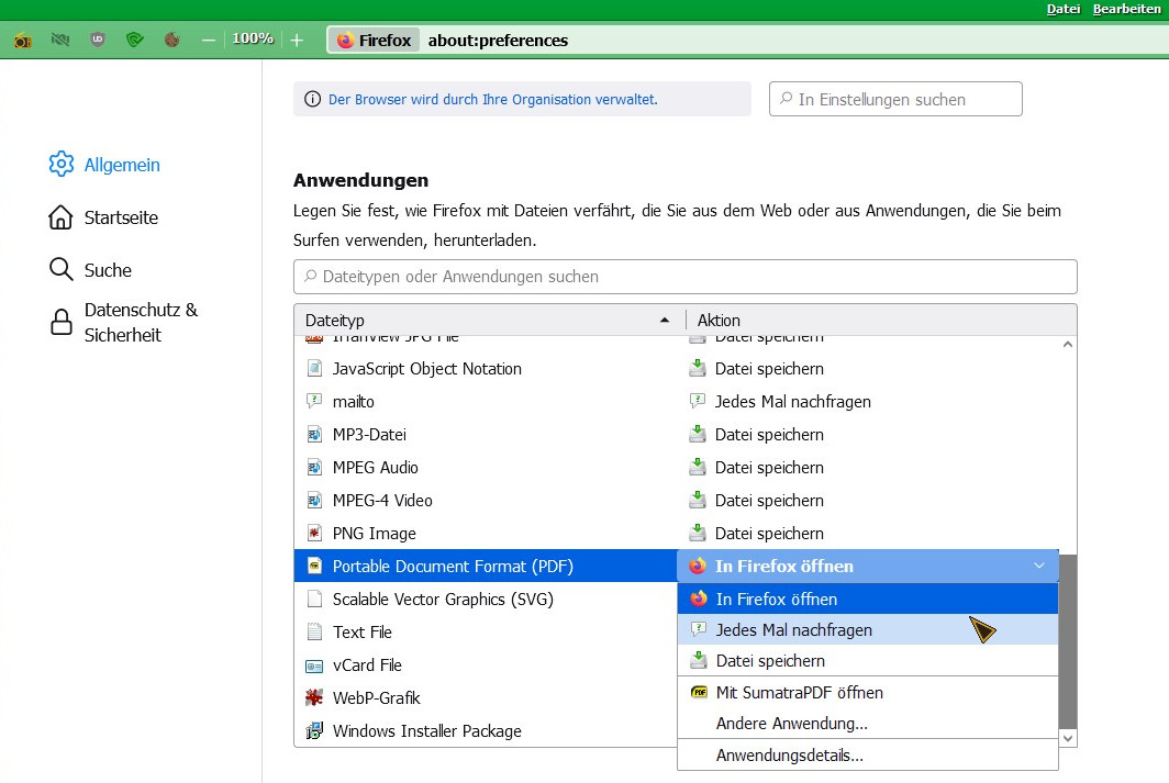 Sie funktionieren auch nicht mehr alle richtig. Bei dem PDF hab ich z.B. immer ausgewählt, dass Firefox immer nachfragen soll was ich will. Er fragt ganz normal nach. Will ich dann aber das PDF nur öffnen, öffnet er es zwar, speichert aber das PDF im Download Ordner ab. Was so nicht gewollt ist und was er früher nie getan hatte. Da landeten die PDFs im "Temp" Ordner von Windows...