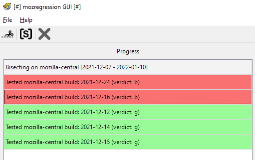 • Hat es denn nach dem Build vom 15.12. einfach aufgehört? Denn zumindest auf macOS funktioniert es bei mir, dass nach den Builds von mozilla-central, die das auf einen Tag eingrenzen können, andere Entwickler-Builds getestet werden, die dann wirklich von dem einen Tag das auf eine einzelne Änderung eingrenzen können. Und dann bleibt im Pushlog auch nur noch ein einziges Bugzilla-Ticket übrig. Auf Windows habe ich das schon sehr lange nicht mehr benutzt, daher weiß ich jetzt nicht, ob das normal ist oder nicht, wenn das dort nicht passiert. Sonst muss ich das später auf macOS nochmal versuchen.