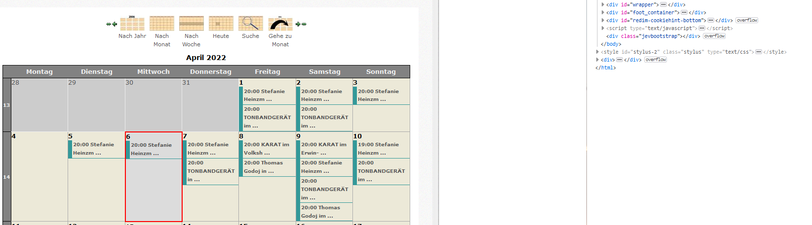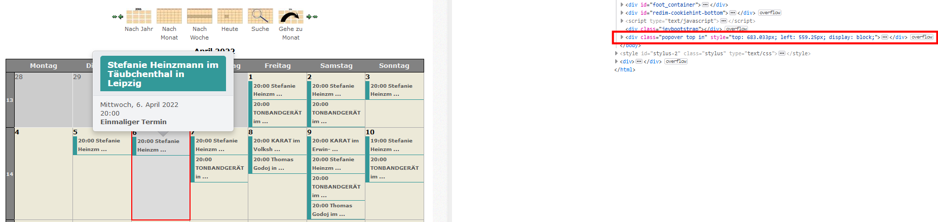 und den Tooltip, der sich öffnet beim hover auf einen Termin.