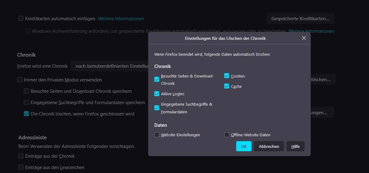 Deswegen habe ich mal vor einigen Jahren mal probiert, diese Einstellung zu nutzen: Unter Cookies und Website-Daten Cookies und Website-Daten beim Beenden von Firefox.