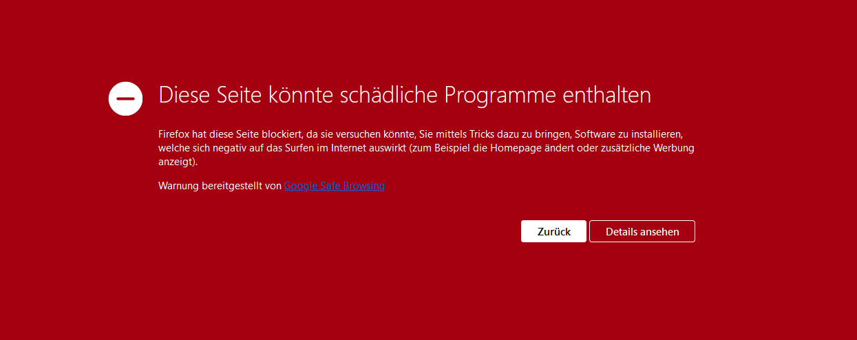 Daraufhin kam eine rote Meldung im Browser das Firefox die Seite blockiert hat, weil sie versuchen könnten mich dazu zu bringen schädliche Software herunter zu laden.