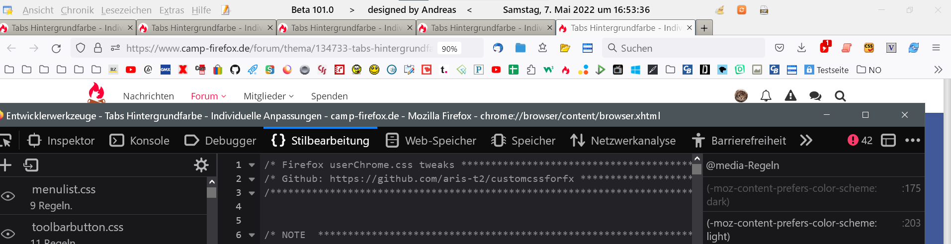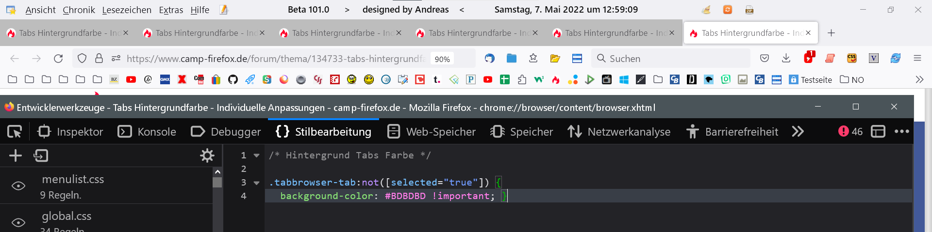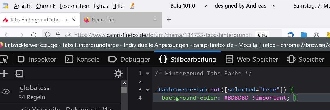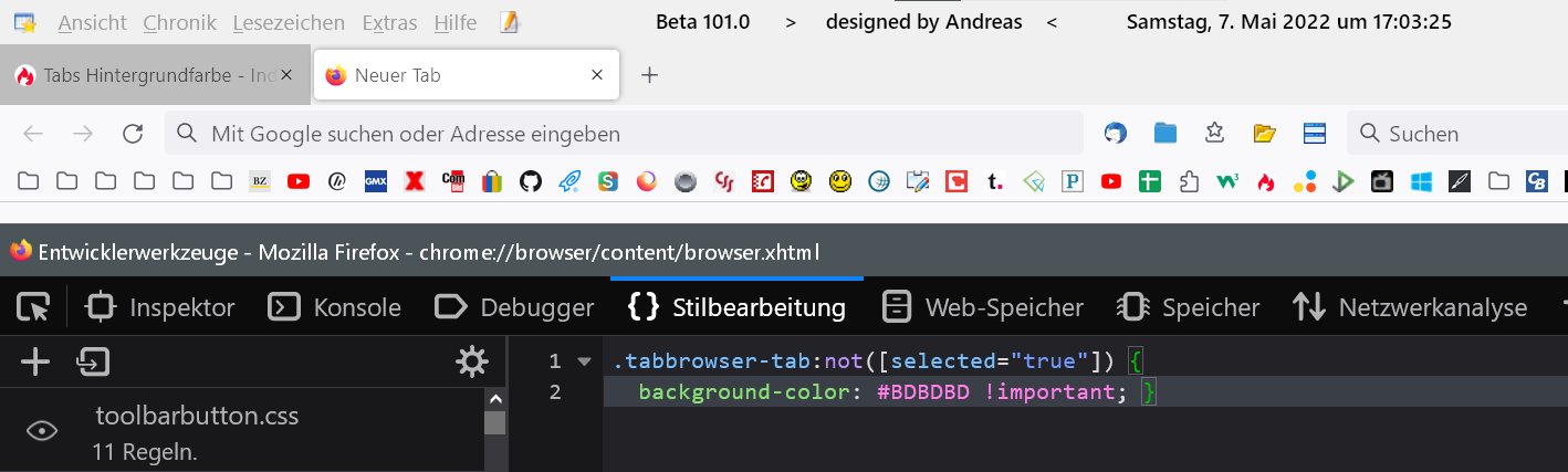 seit heute habe ich FF101.0b3 und Tabs Hintergrundfarbe sieht jetzt komisch aus. Da sieht man weiße Flecken.