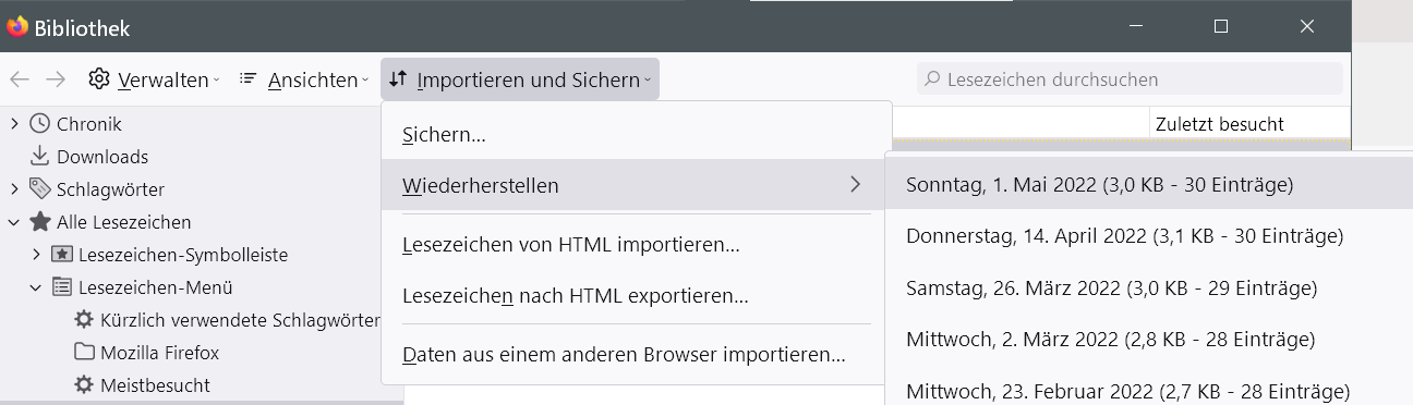 Dann müsstest du über die Lesezeichen-Bibliothek..Importieren und Sichern..Wiederherstellen.. die letzte Sicherung anklicken.