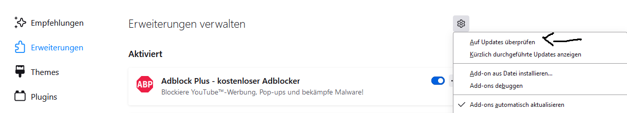 Wenn man in den Einstellungen unter Add-ons und Themes geht und bei den Erweiterungen manuell nach Updates für Add-ons sucht "Auf Updates überprüfen", wird dann auch automatisch für die Plugins nach Updates gesucht oder muss man dazu extra in den Reiter Plugins gehen und dort die Suche nochmal anstoßen? Danke