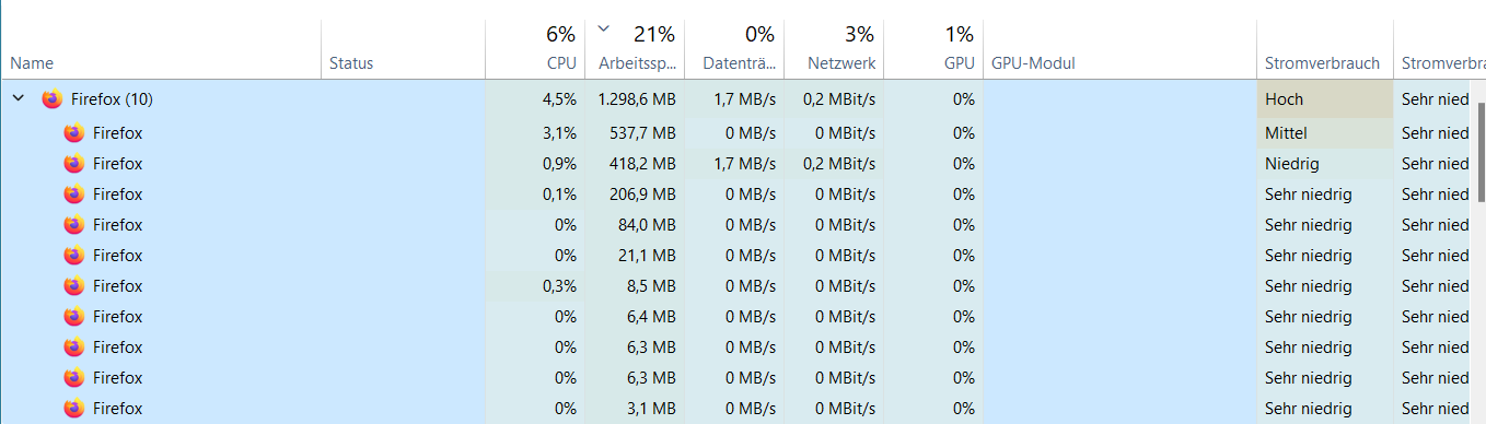 Mir ist bewusst, dass Firefox Tabs in neuen Instanzen öffnet, anders als Chrome, aber für 2 Tabs habe ich 10 Prozesse offen? Wenn ich nur noch einen offen habe, sind es noch 8 Prozesse. Ist das normal? Ich hab nur 2 Addons aktiv; BetterTTV und uBlock.